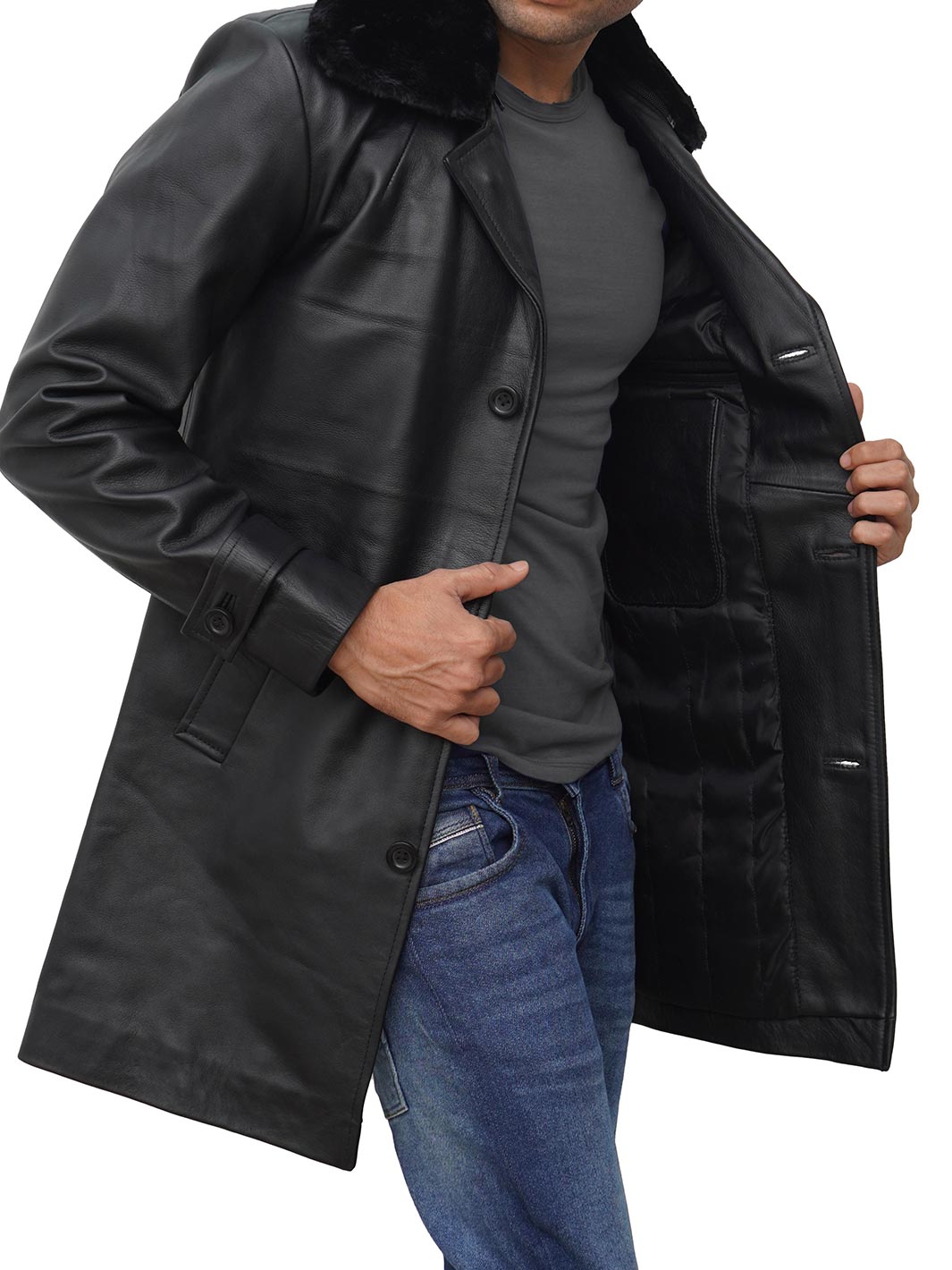 Homme Manteau en Cuir Noir 3/4 avec Col en Fourrure